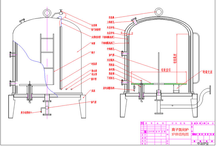 真空氣體氮化爐是由鋼板做成筒狀外殼,里面是由定形的標(biāo)準(zhǔn)耐火磚砌成的加熱工作室,在加熱室和外殼之間填滿了保溫材料。加熱室中有一不銹鋼焊接的密封爐罐,爐罐上部裝真空橡膠密封圈,下部為水冷套,爐蓋頂部裝有均熱風(fēng)機(jī),保證了爐內(nèi)氣氛的均勻。