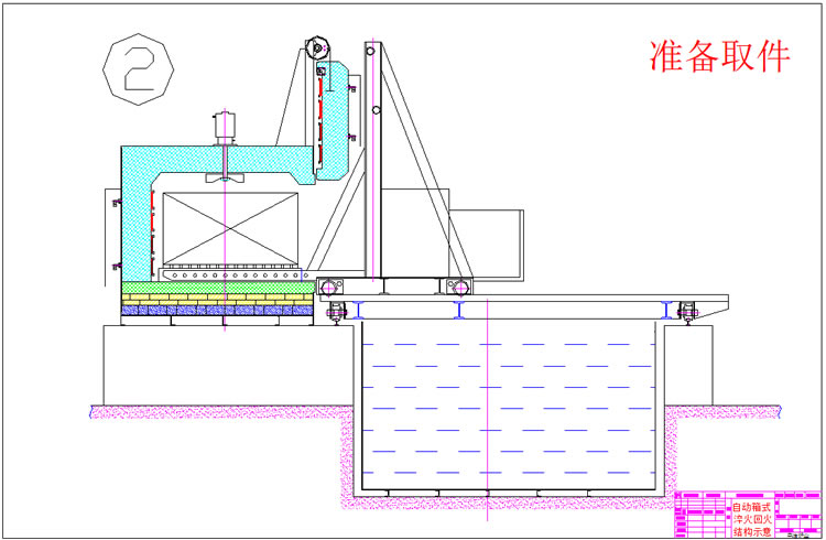 2、淬火裝爐:把料筐吊到裝料平臺上(只需要操作一次)——人工把工件裝入料筐(需方自備)后——按動放料按鈕——中轉(zhuǎn)車從裝料平臺上叉取料筐上升50mm——中轉(zhuǎn)車后退——中轉(zhuǎn)車移向淬火爐位置——淬火爐門開啟——中轉(zhuǎn)車把工件送入爐膛——中轉(zhuǎn)車自動退出——爐門關閉——加熱爐啟動加熱——裝爐工作完成。