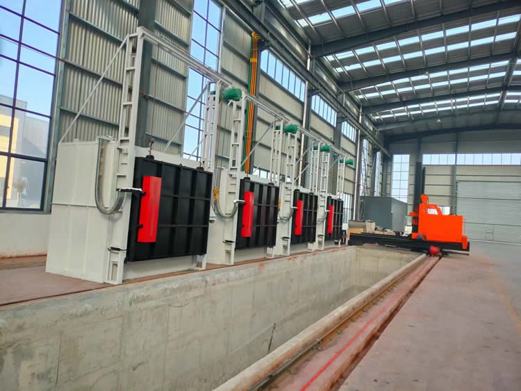 3、出爐淬火:按動(dòng)出爐按鈕——中轉(zhuǎn)車移動(dòng)到淬火爐爐口——爐門開啟——中轉(zhuǎn)車把工件叉出爐膛——中轉(zhuǎn)車后退并下降進(jìn)入淬火介質(zhì)——中轉(zhuǎn)車帶動(dòng)工件在水中左右擺動(dòng)(次數(shù)可調(diào))——中轉(zhuǎn)車上升瀝水——淬火工作完成